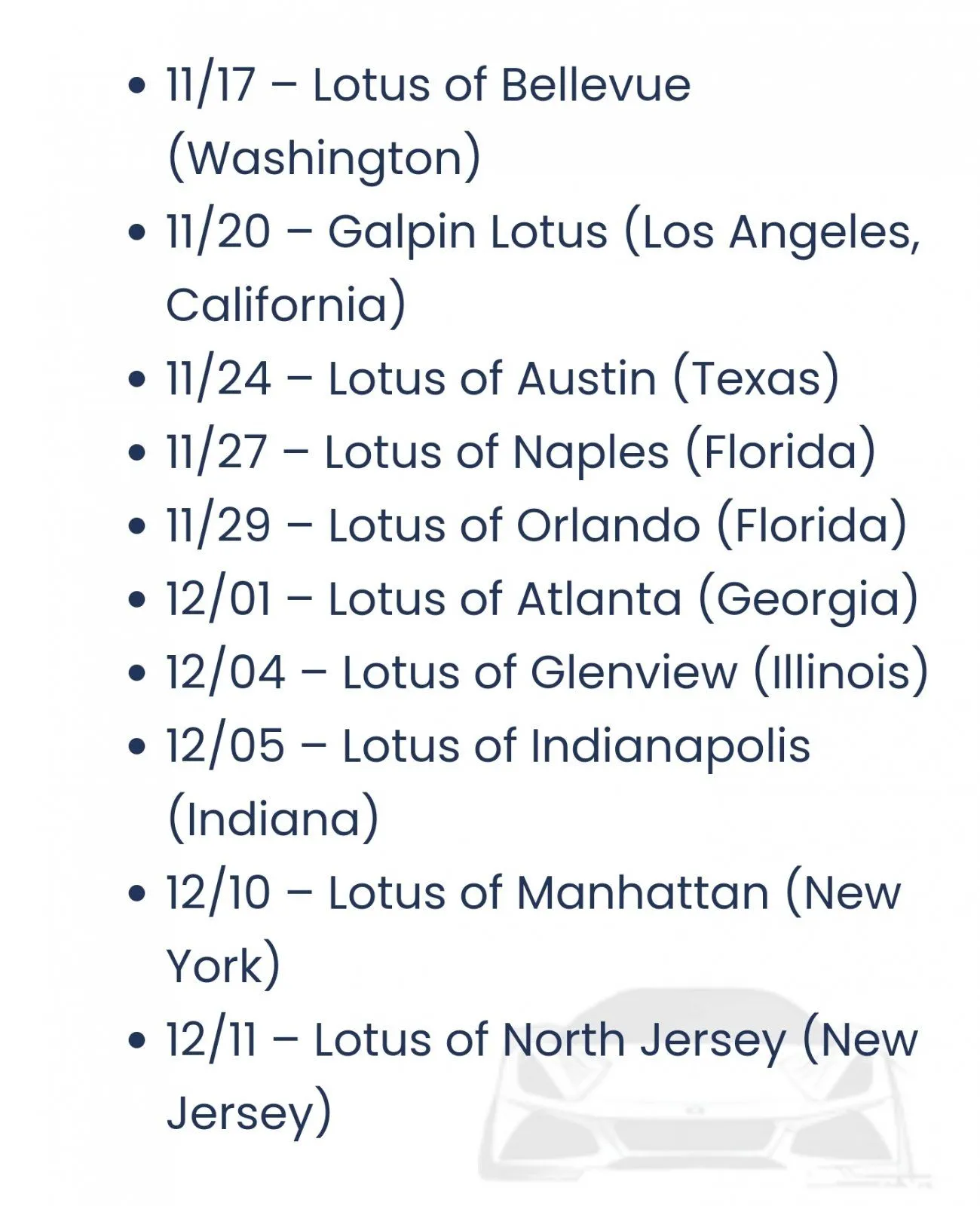 Here is what @supersix posted. Hope this helps.Anyone know if Lotus has posted any schedule of when where the Emira will be in the US. over the next 6 months or so. You would think that they would want to post this well in advance.. you know .. build up interest, get people out to view the car..
