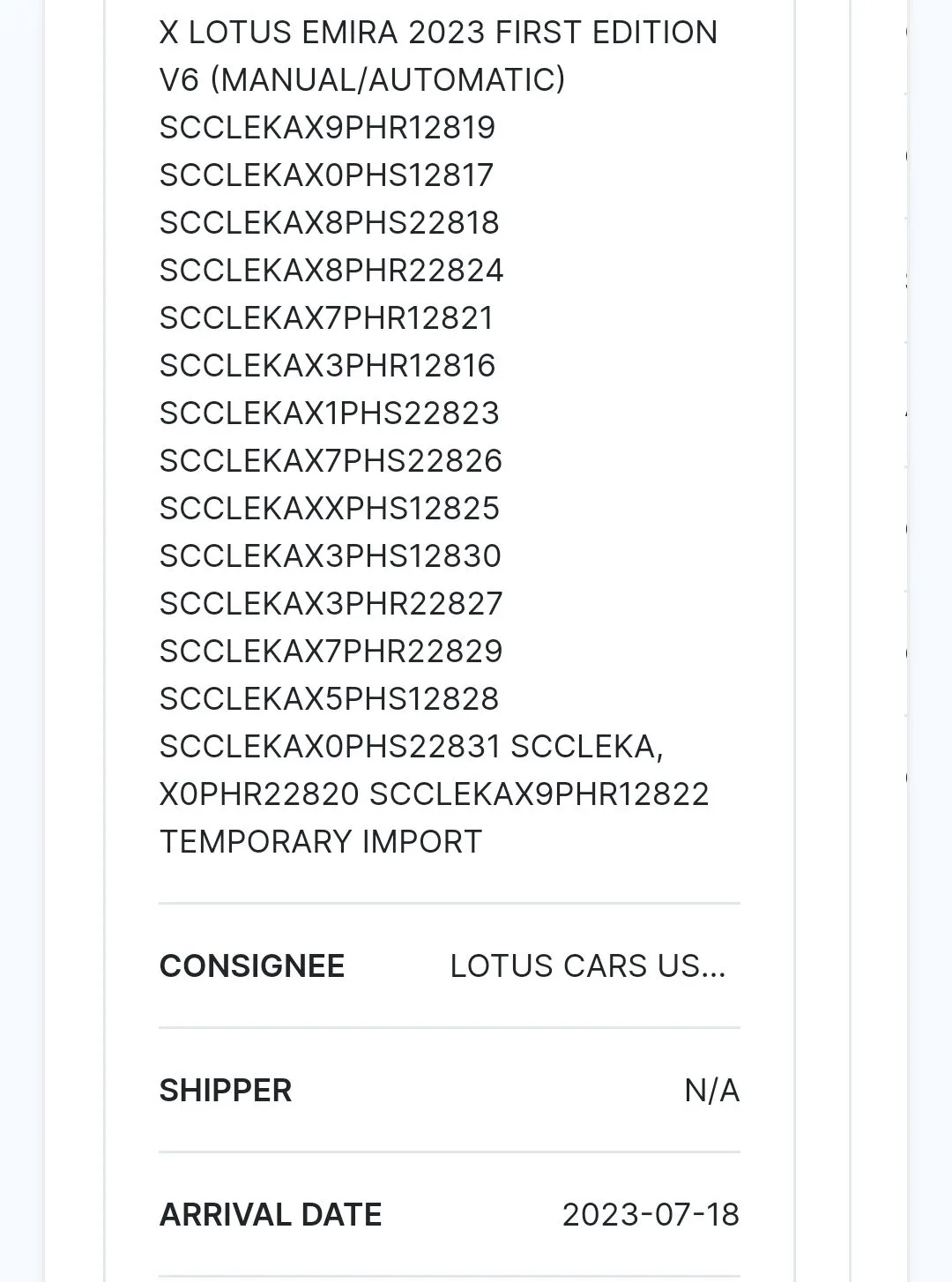 These are most likely the cars they need to give all those test drives at the Quail during Monterey car week - they arrived in port a little while ago.Speaking of shipments. In other news, 16 Emiras, all 2023 year (i.e. nonproduction), arrived in the US on 7/18: