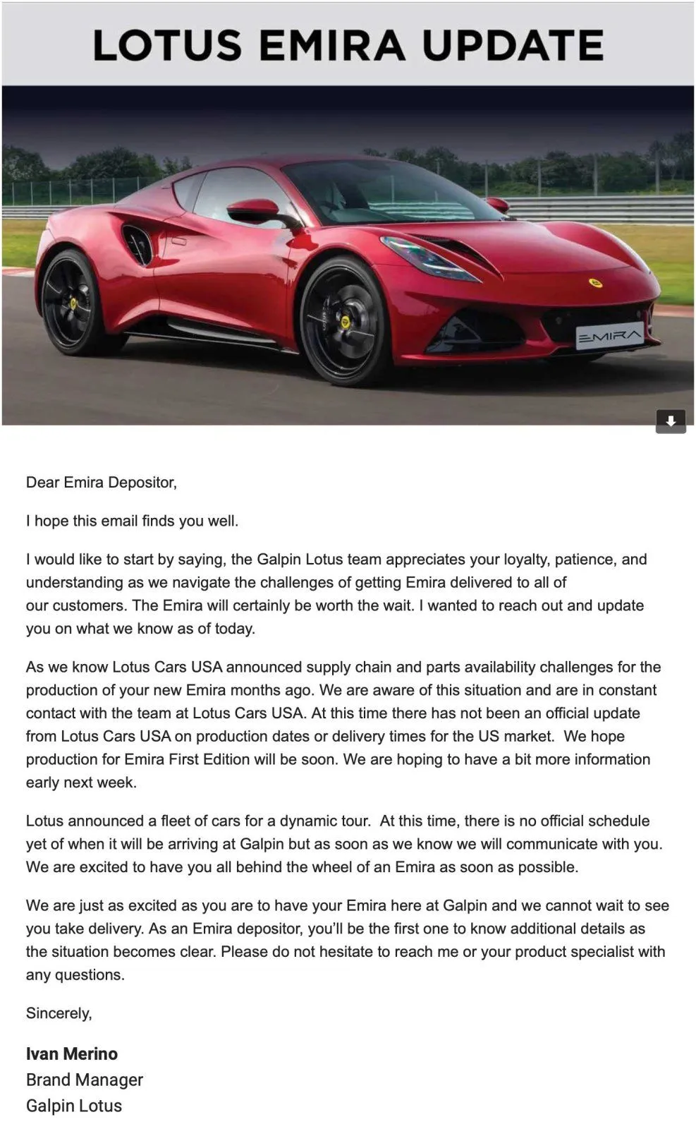 No idea. Haven't received anything from my dealer. Vauge but at least the dealership is communicating. Seems to be a Lotus issue, not the dealer.