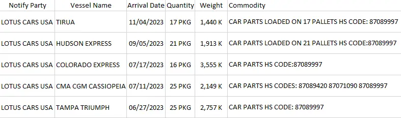 Nothing but pallets of car parts?The last 5 received ocean shipments by Lotus USA have been mixed pallet shipments of car parts. These still aren't in the volume that I would expect for full scale repair parts supply to dealer service departments, but it's a good sign that they are gearing up.