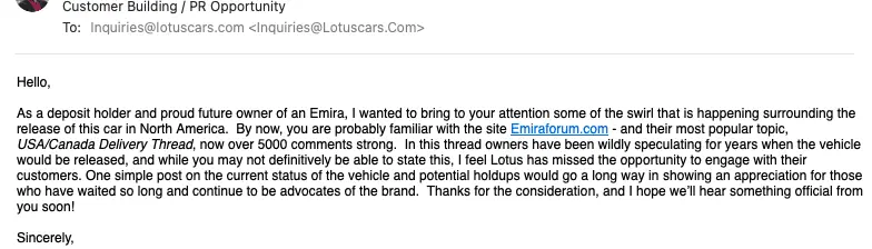 I’ve done the same email to multiple Lotus contacts …………crickets!I have tried that several times (including Lotuscars USA) over the last few months to multiple Lotus addresses. Heard nothing.