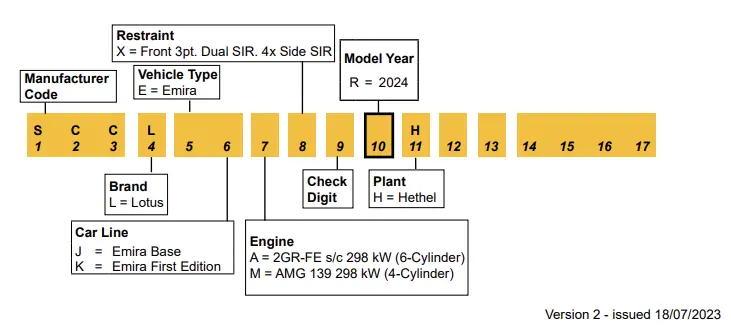 If it helps, digit 12 is set as "N" on my UK-specification V6 Auto - probably a region specification but there's no digit for gearbox type or RHD/LHD above either (Later Evoras had both fields specified - 12 was region spec and 13 was build type 1=std/2=proto but that's no real guide)..... Digit 13 is "2" on my car....Here's the decoder. We know the 13th digit indicates auto or manual. 1=manual, 2=auto. The 14-17th digit is the sequence number. The big mystery is the 12th digit. In the past this indicated the market. A=US, B=Canada, etc. However, the cars delivered to US have had both A and B letters in the 12th position, so we don't know what this digit now signifies.