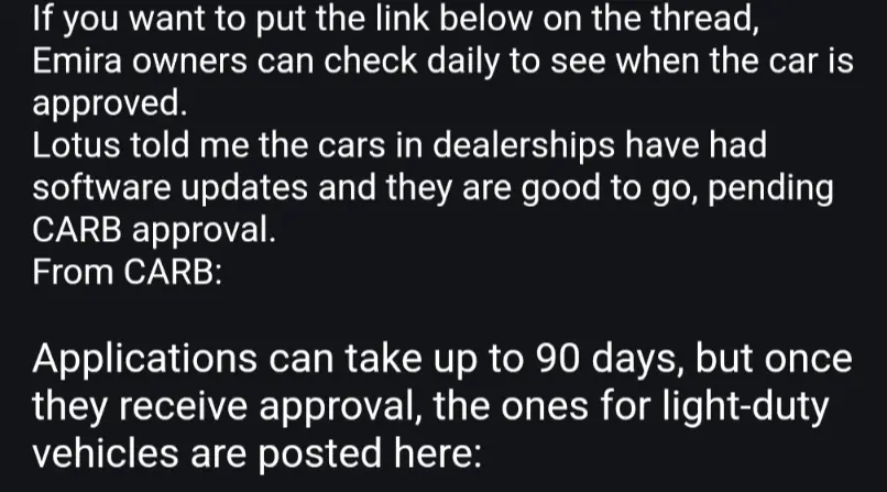 The only problem with checking on the CARB site every day for the Emira’s approval is that CARB only posts updates periodically, maybe once a month, maybe less. Hopefully dealers don’t have to wait until the E.O. actually gets posted on this site!View attachment 36270