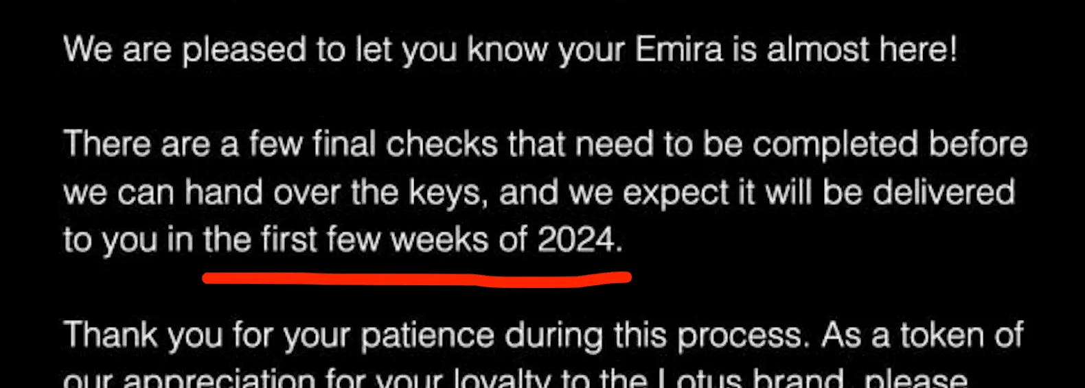 And then on the other hand, as US customers we've literally received zero meaningful communication from Lotus following the placement of our deposits and locked-in orders, because apparently the one constituency they feel NO responsibility toward whatsoever is their paying customers.