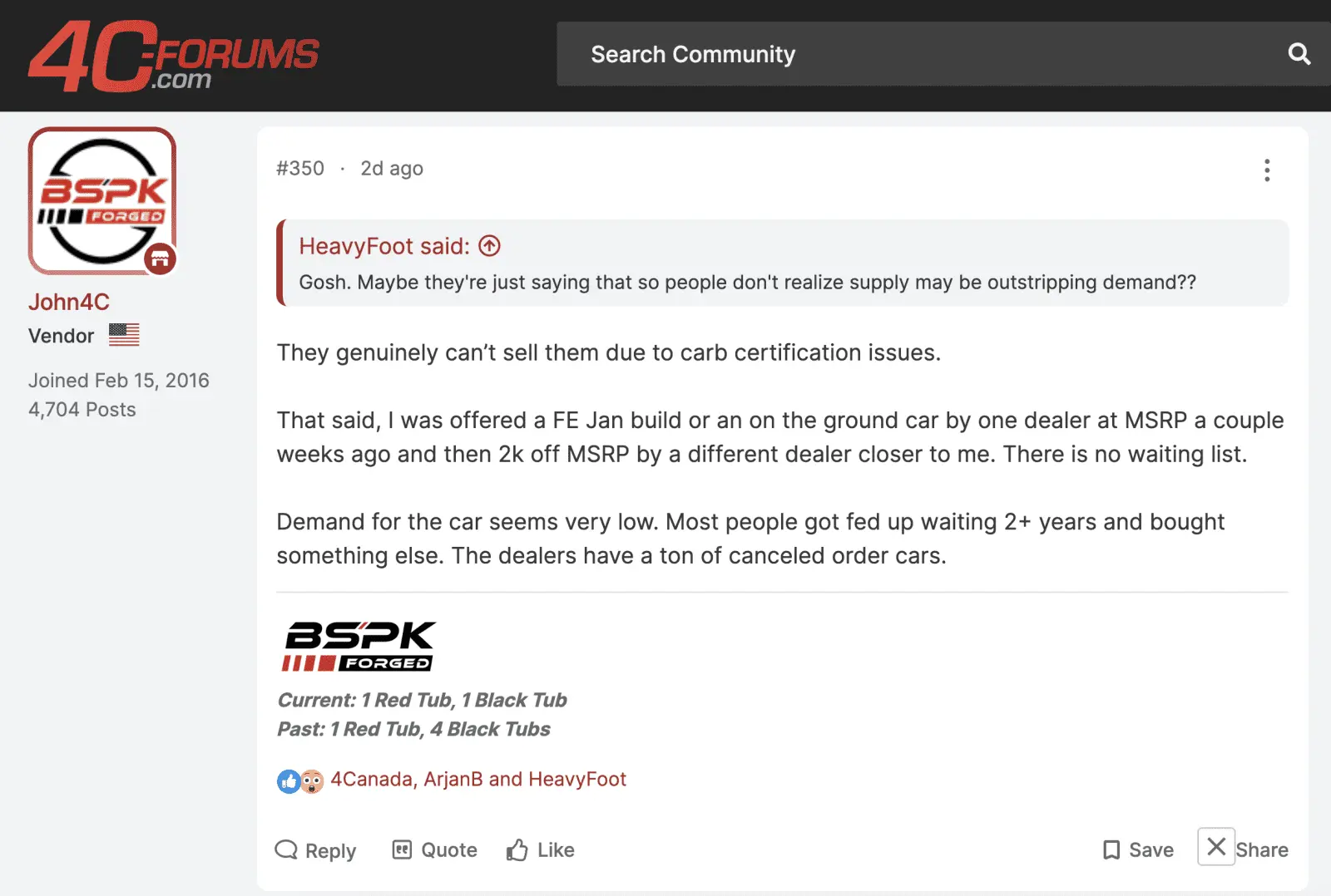 The good news is, it looks like cars are going to be available for more than just depositors once they can be sold. For those interested in FE 1.0 cars, call some dealers. You might be pleasantly surprised.