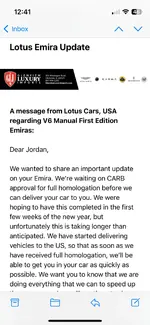 Looks like they are metering this out. I got my copy of this email a couple of days ago.Its great that "some" customers are getting notes from Lotus...But you'd think that ALL USA position holders with a car scheduled for delivery in the next 4-6 months would get this. It ain't hap-nin
