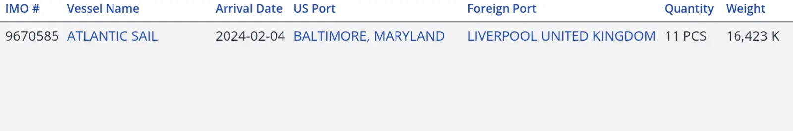 How are you verifying this info?11 additional units arrived this week to the Port of Baltimore on the vessel Atlantic Sail.
