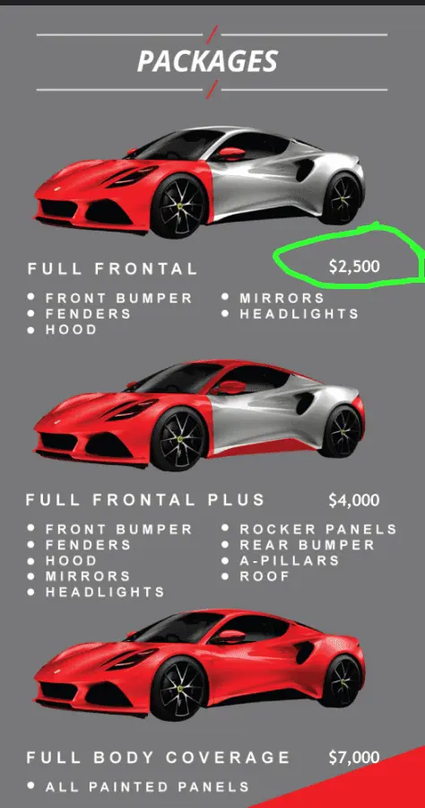 Based on my other cars (Elise and 4C) I'm leaning toward the first option, but I'm concerned about the rocker panels. I didn't get the BlackPack, so the second option seems overkill protecting the roof and rear of the car (where I have not observed damage on my existing vehicles. Appreciate everyone's thoughts, experiences and recommendations.