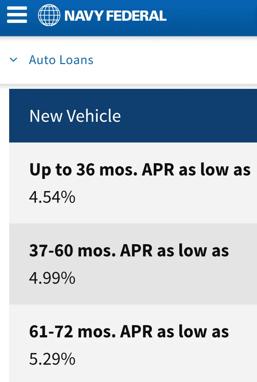 You can also get 2.25% rate from them but you have to have the same amount of cash in the bank to get that rate. Your paying yourself back. 4.99% for 60 months is the lowest Auto rate I could find with a credit score of 847.