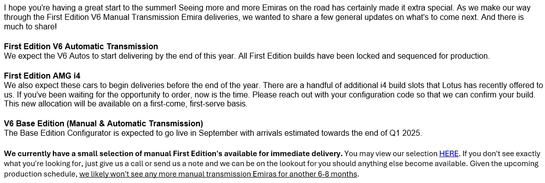 After receiving this, I asked if I was interpreting it correctly that the V6 automatic was being further delayed from its original expected summer deliveries and he confirmed that was the case.