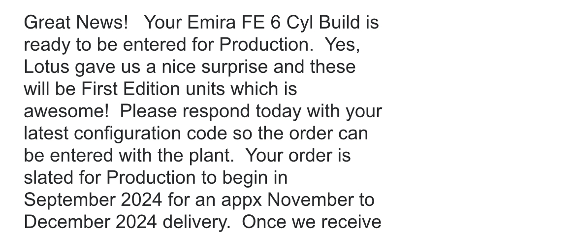 My communication from Lotus said Production in September with delivery in November/December.Did he use the phrase, 'worth the wait?'