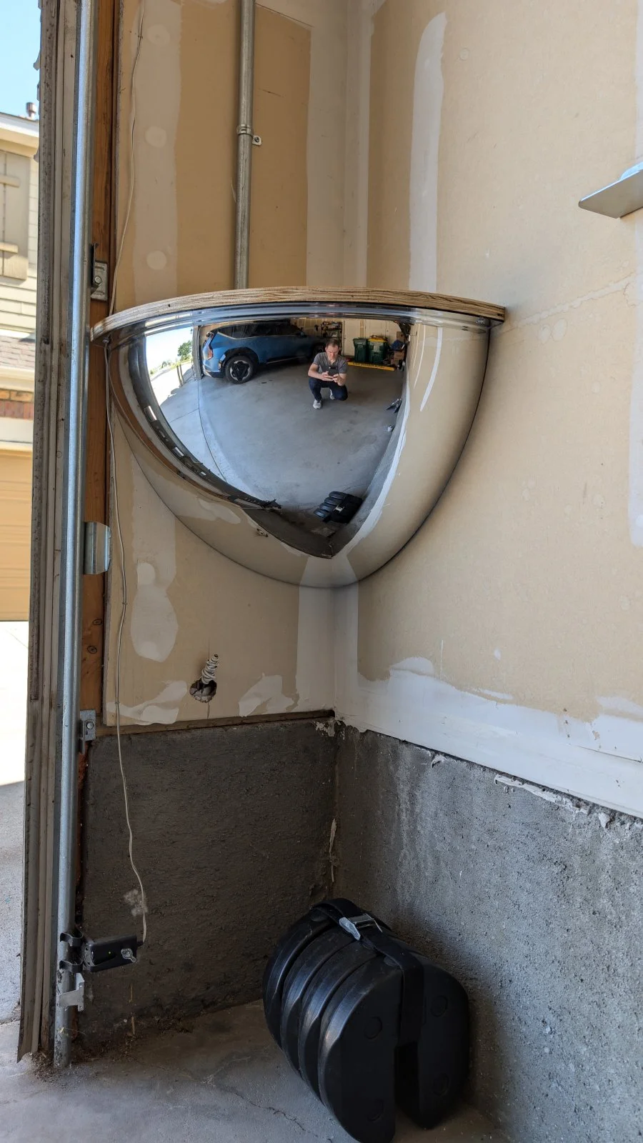 Enter a quarter-dome security mirror. I made a shelf to hold it and on which I can put quick detailing stuff. Just had to notch out around the conduit for the EV charger.
