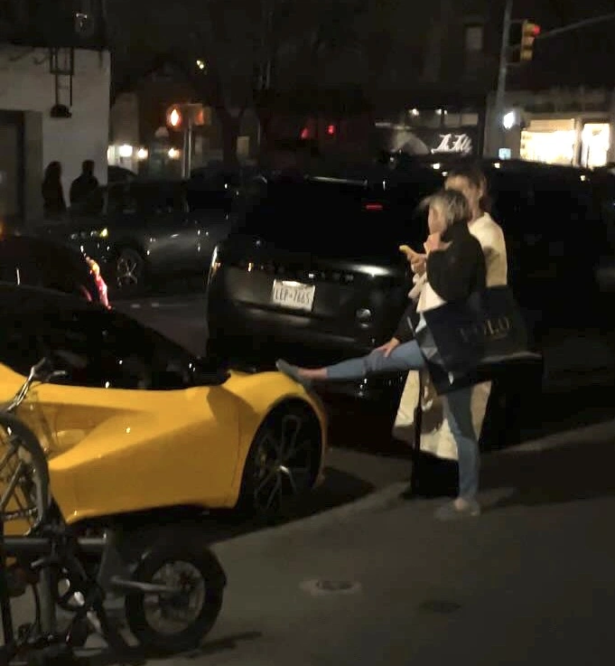 Demonstrating Heel/toe driving technique. And toe-in metric.What is even happening here? Taking a photo of her shoe on your car?